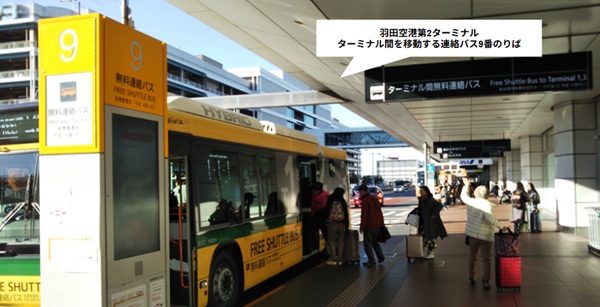 羽田空港第2ターミナル、9番バス乗り場から第1ターミナル、8番バス乗り場へ移動