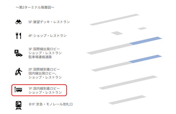 第1から第2へ移動するのは、国内線に乗り継ぐケースです。移動経路は以下の3つ(連絡通路・モノレール・バス)。